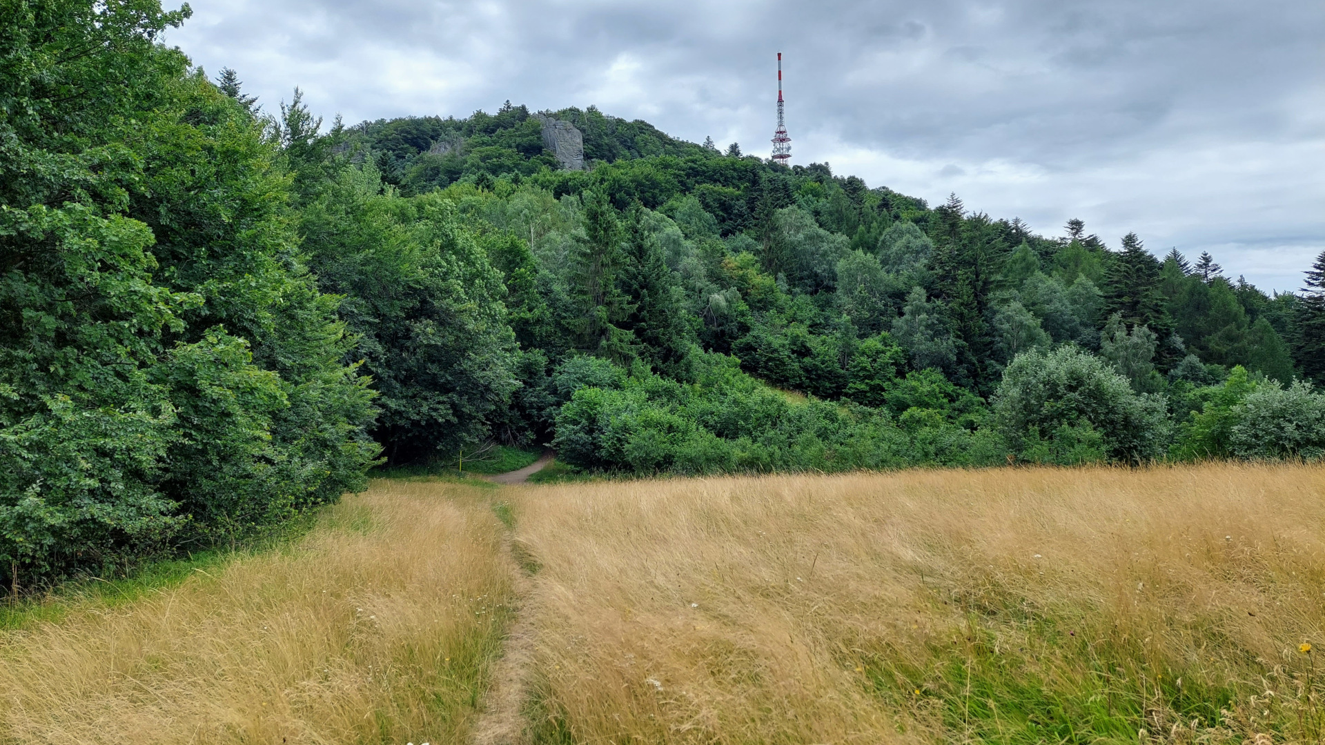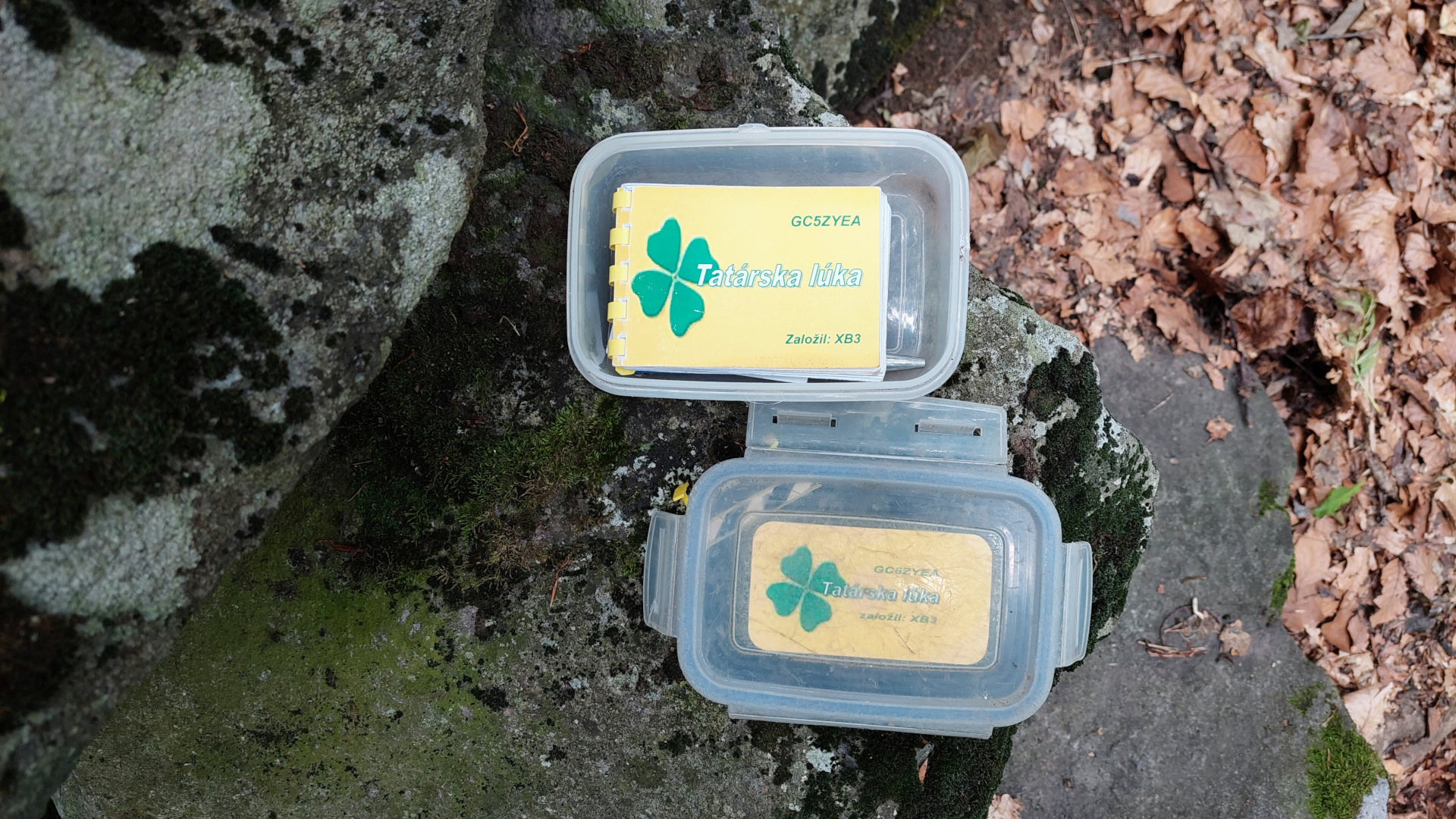 Tretia nájdená počas prechádzko – turistiky na Sitno sa volá Tatárska lúka. Lúka je to podľa mňa vcelku obyčajná, avšak vďaka nej mi pribudla skrýša do zbierky nájdených. A kúsok od kešky výhľad na Sitno – viď tie skaly a vysielač.