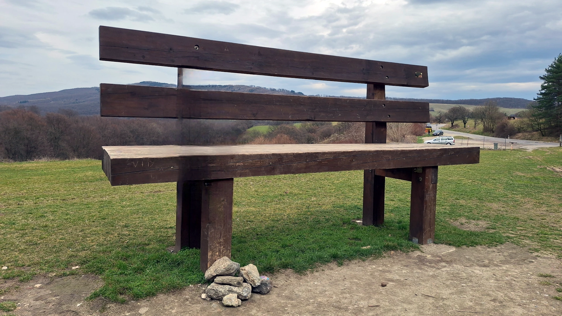 Po tom, čo sme si pozreli výhľad z rozhľadne na Vápennom vrchu a nejaký skalný oný s príznačným názvom Skalky, vrátili sme sa späť k autu. Parkovali sme hneď povedľa poslednej miestnej atrakcie – obrej lavičke.