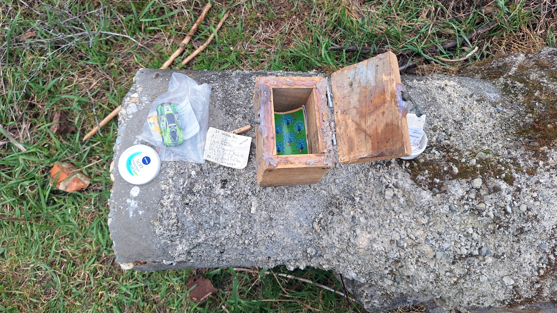 Krabička sa nakoniec nachádzala iba pár metrov od parkoviska (od auta) a podľa pomôcky som ju objavil na prvý pohľad.